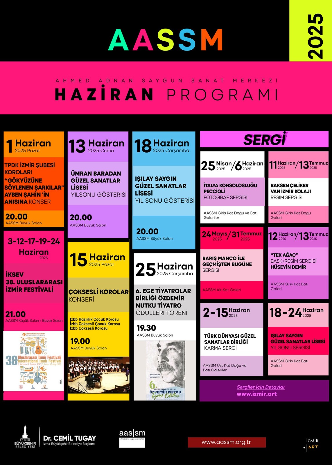 İzmir Büyükşehir Belediyesi Ahmed Adnan Saygun Sanat Merkezi (AASSM), haziran ayında dopdolu bir takvimle İzmirlileri sanatla buluşturmayı sürdürüyor. Müzik, tiyatro ve sergi alanında birbirinden özel etkinliklere ev sahipliği yapan merkez, sanatı herkes için erişilebilir kılmaya devam ediyor.