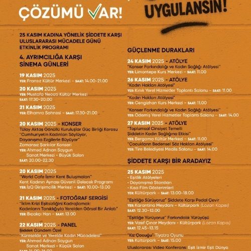 İzmir Büyükşehir Belediyesi, 25 Kasım Kadına Yönelik Şiddete Karşı Uluslararası Mücadele Günü kapsamında, kent genelinde “Şiddete Karşı Bir Aradayız” ve “Birlikte Güçleniyoruz: Şiddetsiz Bir Kent İçin Kadın Dayanışması” temalarıyla, kadına yönelik şiddete karşı dayanışmacı ve katılımcı etkinliklerin yer aldığı bir farkındalık programı hazırladı. Kadınların güçlenmesini destekleyen, şiddetle mücadeleyi görünür kılan ve toplumsal cinsiyet eşitliği mücadelesini destekleyen etkinlikler, 19-27 Kasım tarihleri arasında İzmir’in farklı ilçelerinde gerçekleştirilecek.